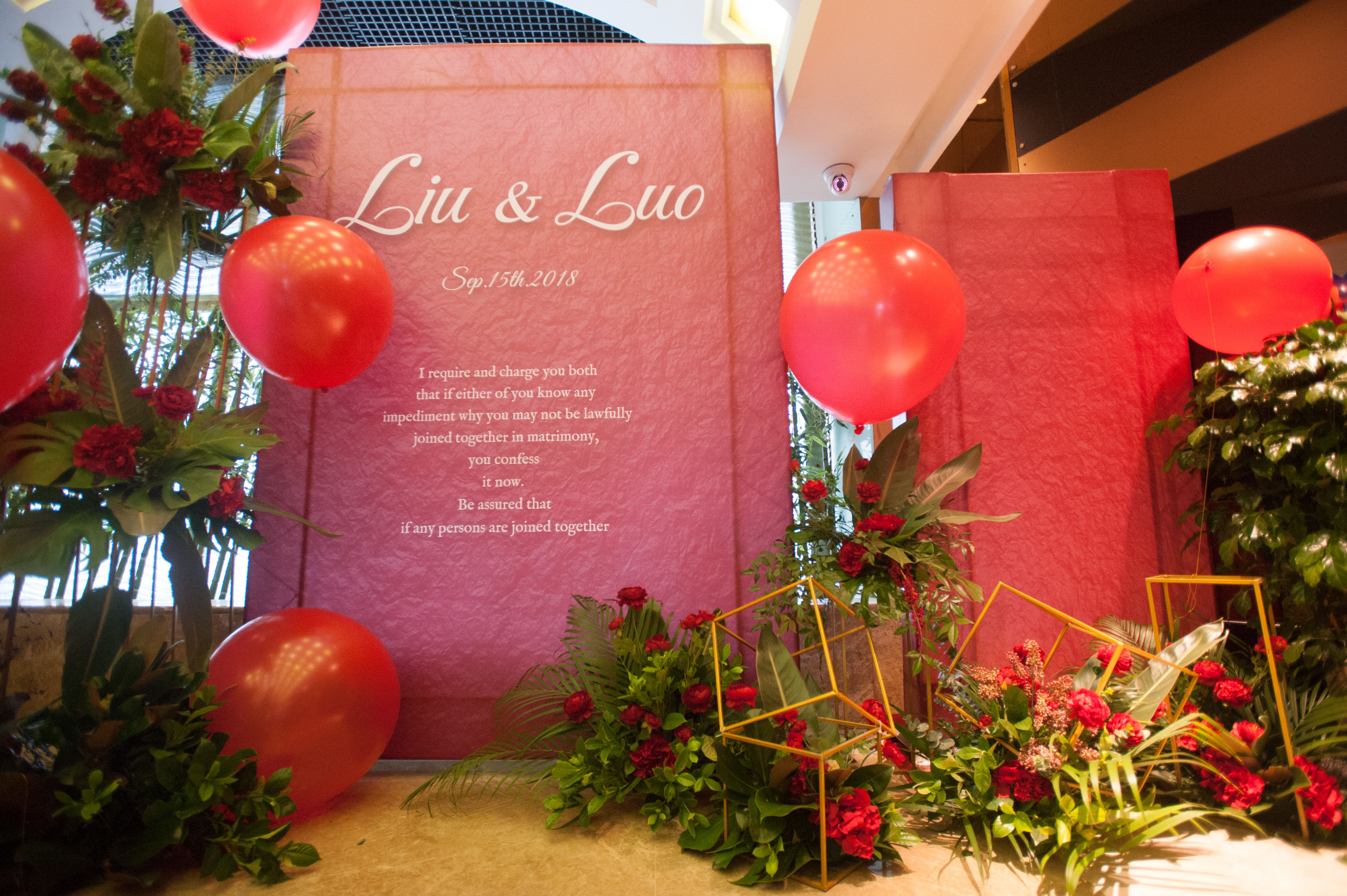 在签到台放置的鲜花和仿真组合的花艺,增加签到台与婚礼主题的整体性,使签到台显得更加别致