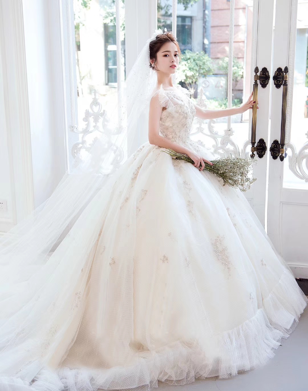 店内所有婚纱都是设计师款,淮安市场没有同款!进口面料纯手工制作。