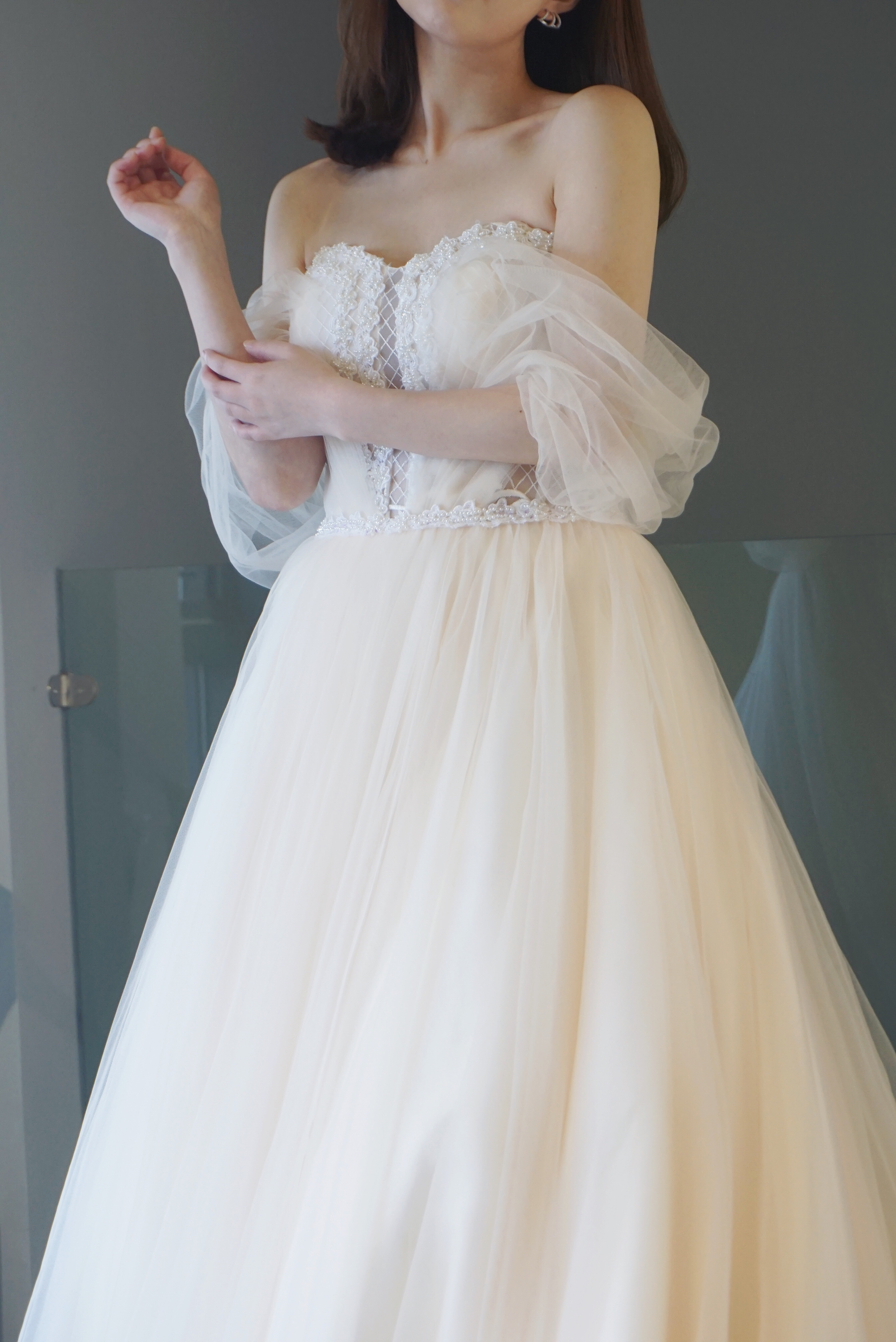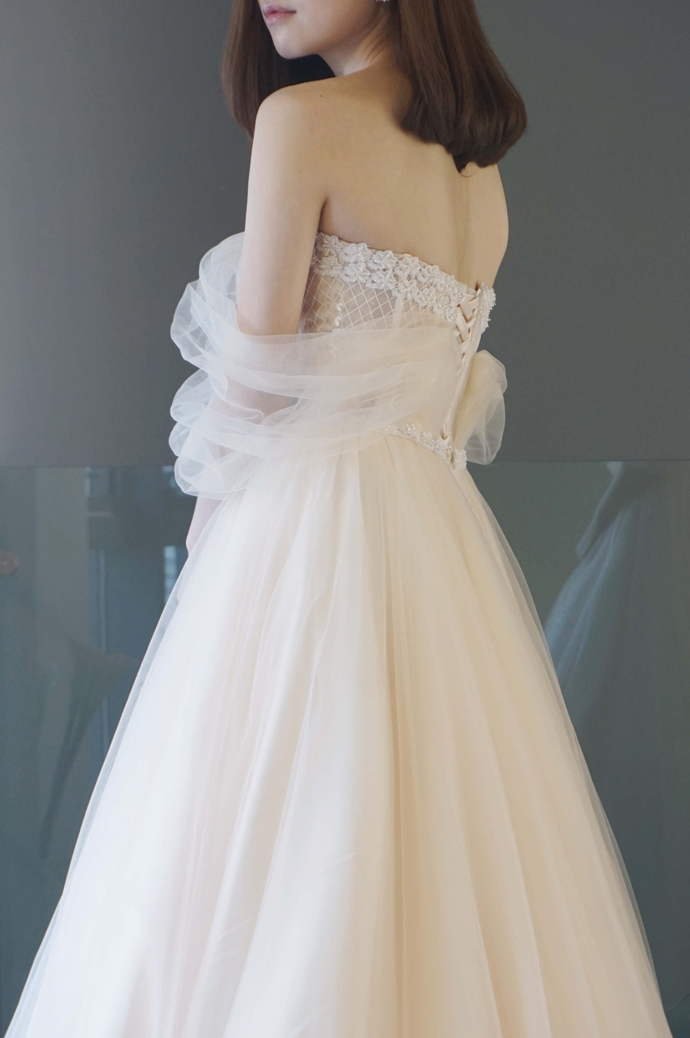 低调淡雅修身鱼骨设计抹胸出门纱