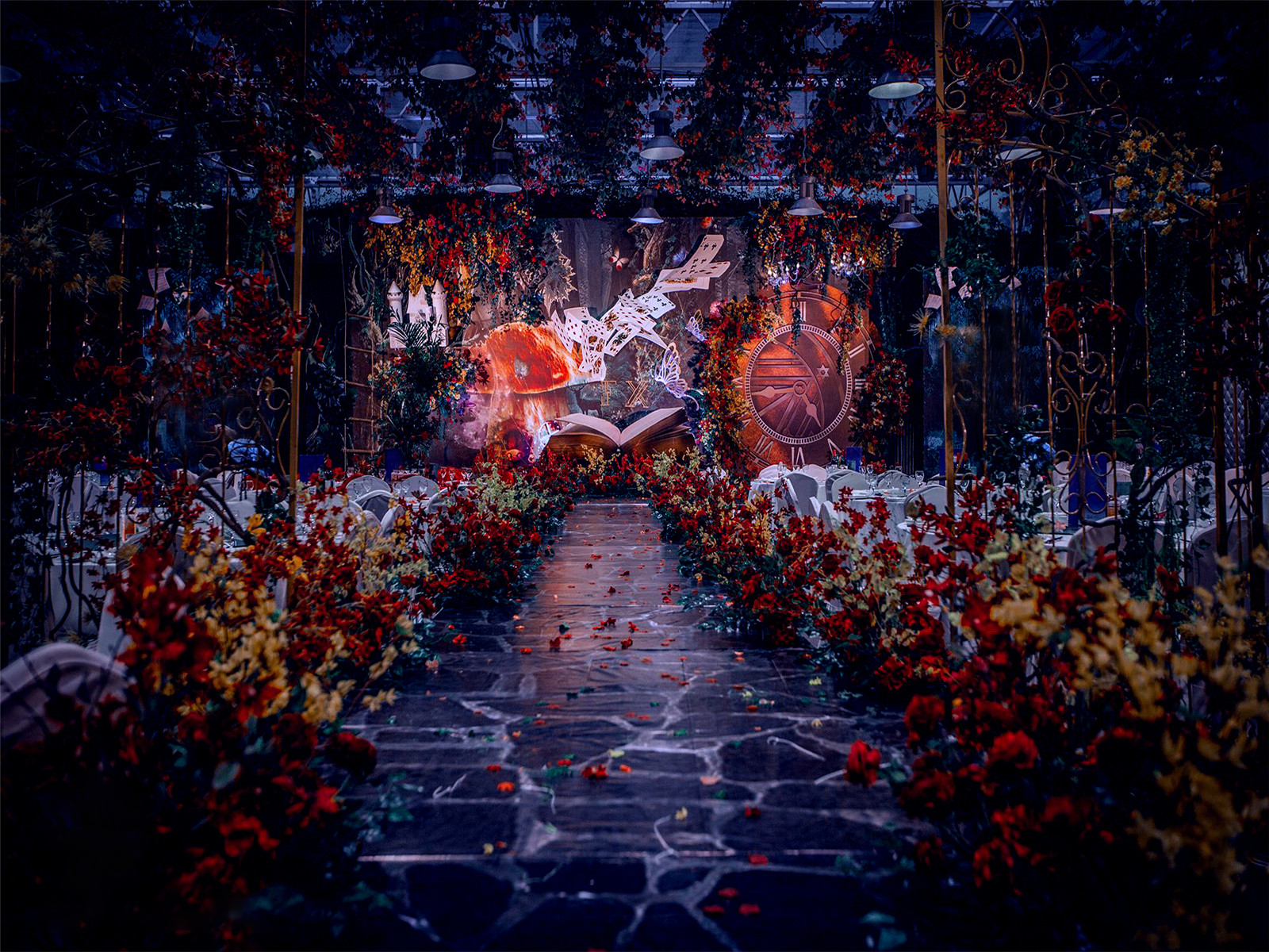 3:设计师一对一专设计属设计KT板造型(30平方内) 4:豪华金色罗马盆路引和花艺装饰8个/花瓣龙珠灯路引8个(二选一)5:唯美欧式铁艺花艺竖琴1套 6:欧式时尚铁艺贵妃椅1套和花艺装饰 7:豪华浪漫高仿真樱花树1棵 8:专业钢结构T台10M*1.8M 9:T台末端花艺装饰10:T台两侧高仿真花艺花排11:红地毯或主题色地毯