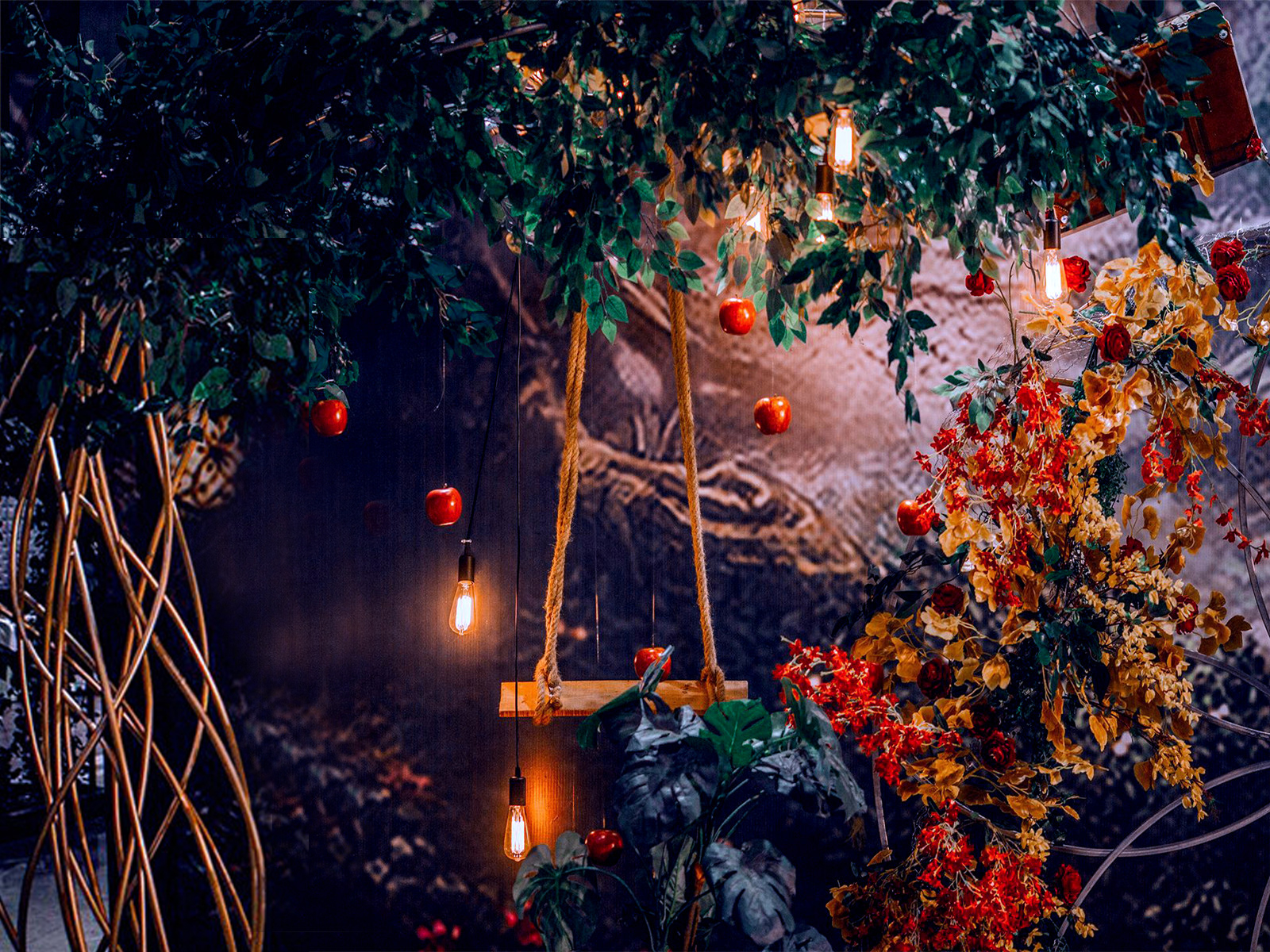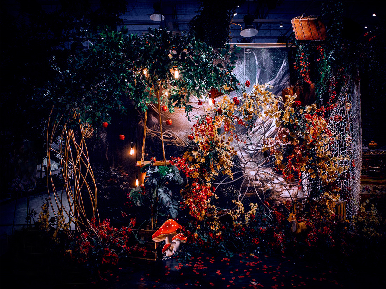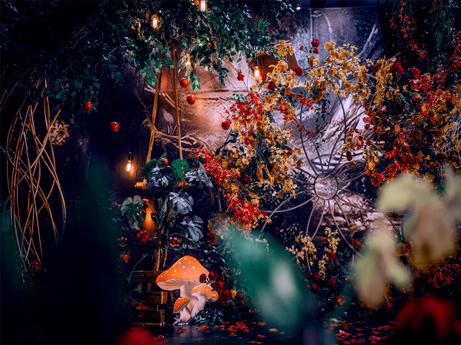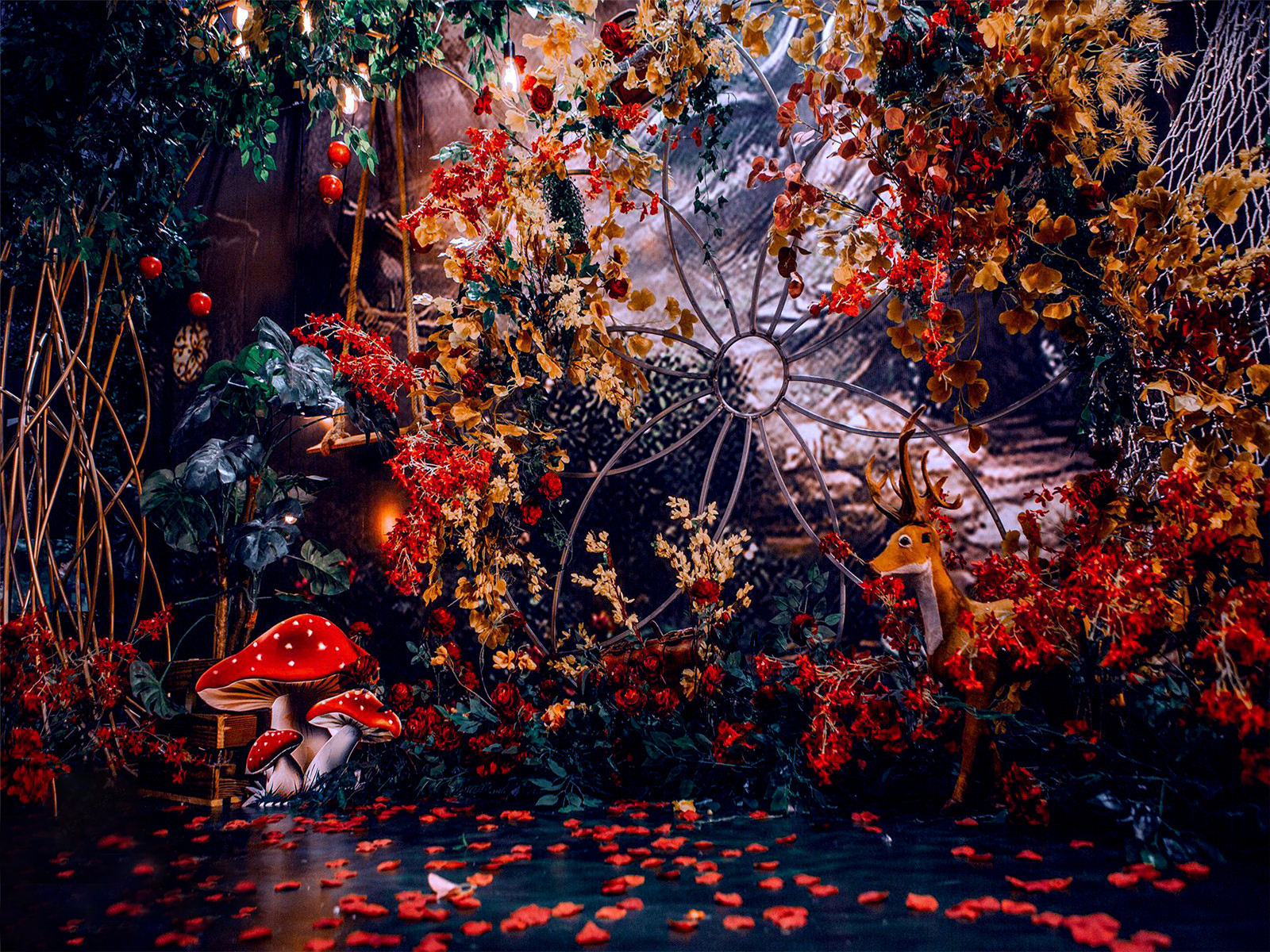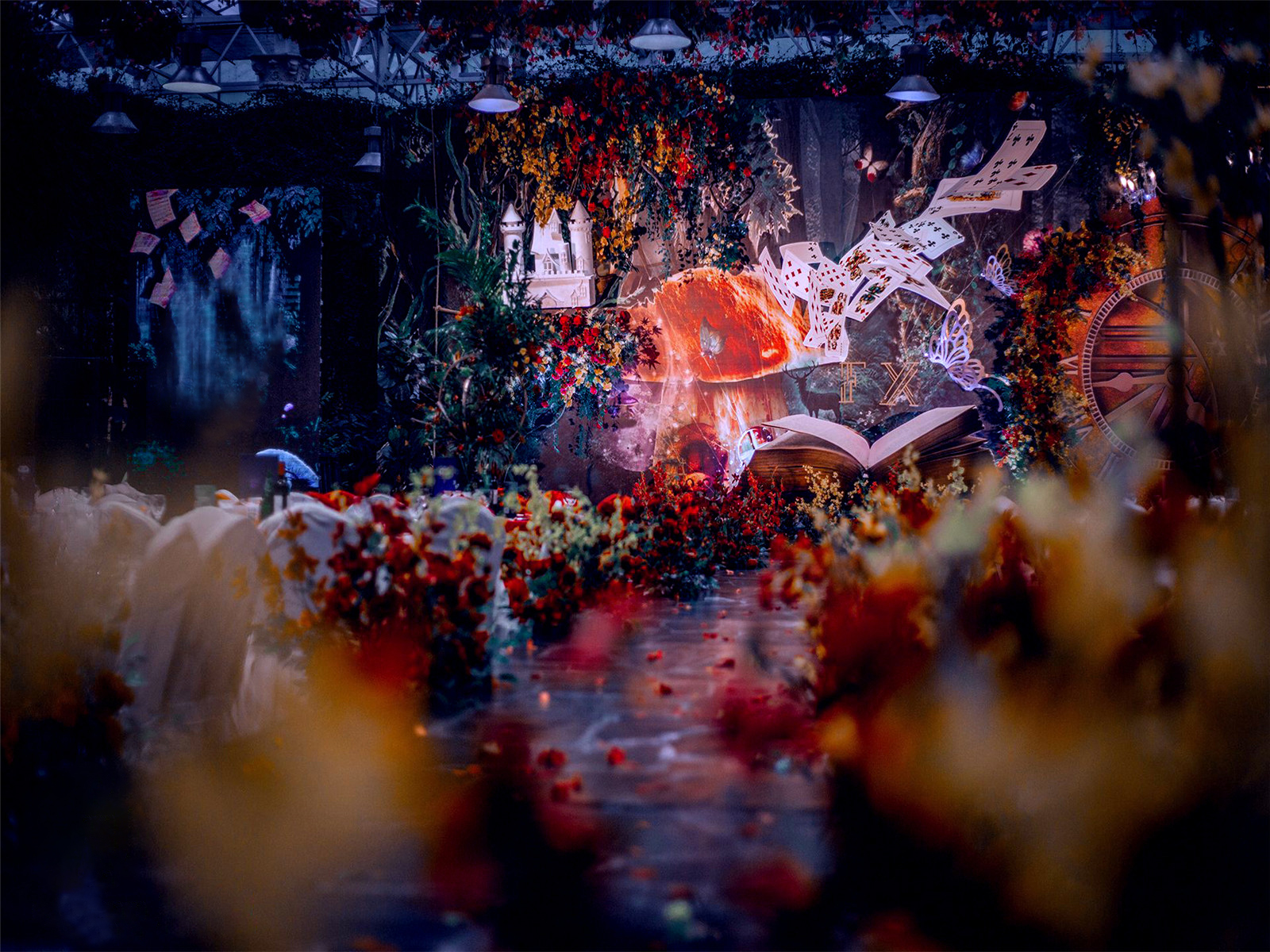 1:超大豪华布艺帷幔背景(3M*6M复式三块背景)结合KT板造型/豪华布艺帷幔(3M*4M)高清写真喷绘(3M*2M)组合背景/豪华布艺背景(3M*6M)和KT板造型组合背景/豪华飘顶一个(3M*6M)结合KT板造型2:精美定制雪弗板花瓣装饰1组