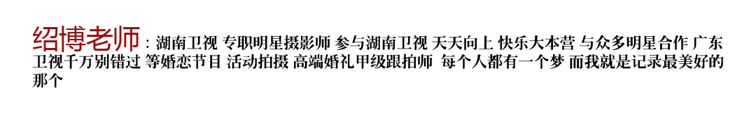 绍博,湖南卫视专职明星摄影师. 参与湖南卫视《天天向上》 《快乐大本营》与众多明星合作。 参与广东卫视《千万别错过》等婚恋节目。国内知名高端婚礼甲级跟拍师!每个人都有一个梦,而我的梦就是记录最美好一个又一个美好的瞬间,也同时记录着自己那一刻最诚挚的情感。用自己专业的技术和敬业的精神为一对对新人留下一生的回忆!