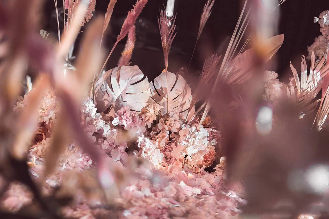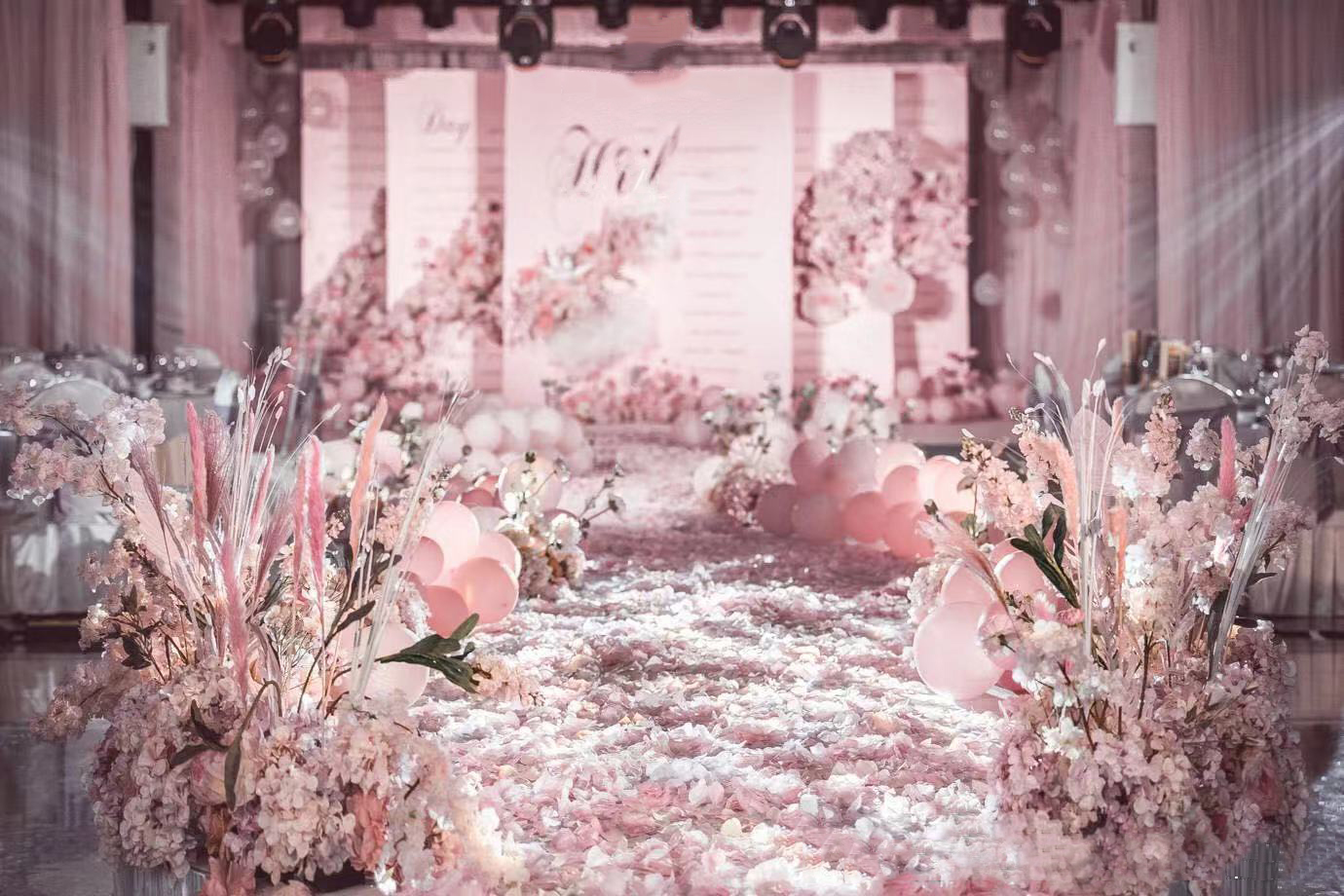 舞台区背景搭建 主题设计背景板 主题仿真花艺 舞台区两侧立体主题装饰 婚道路引8个