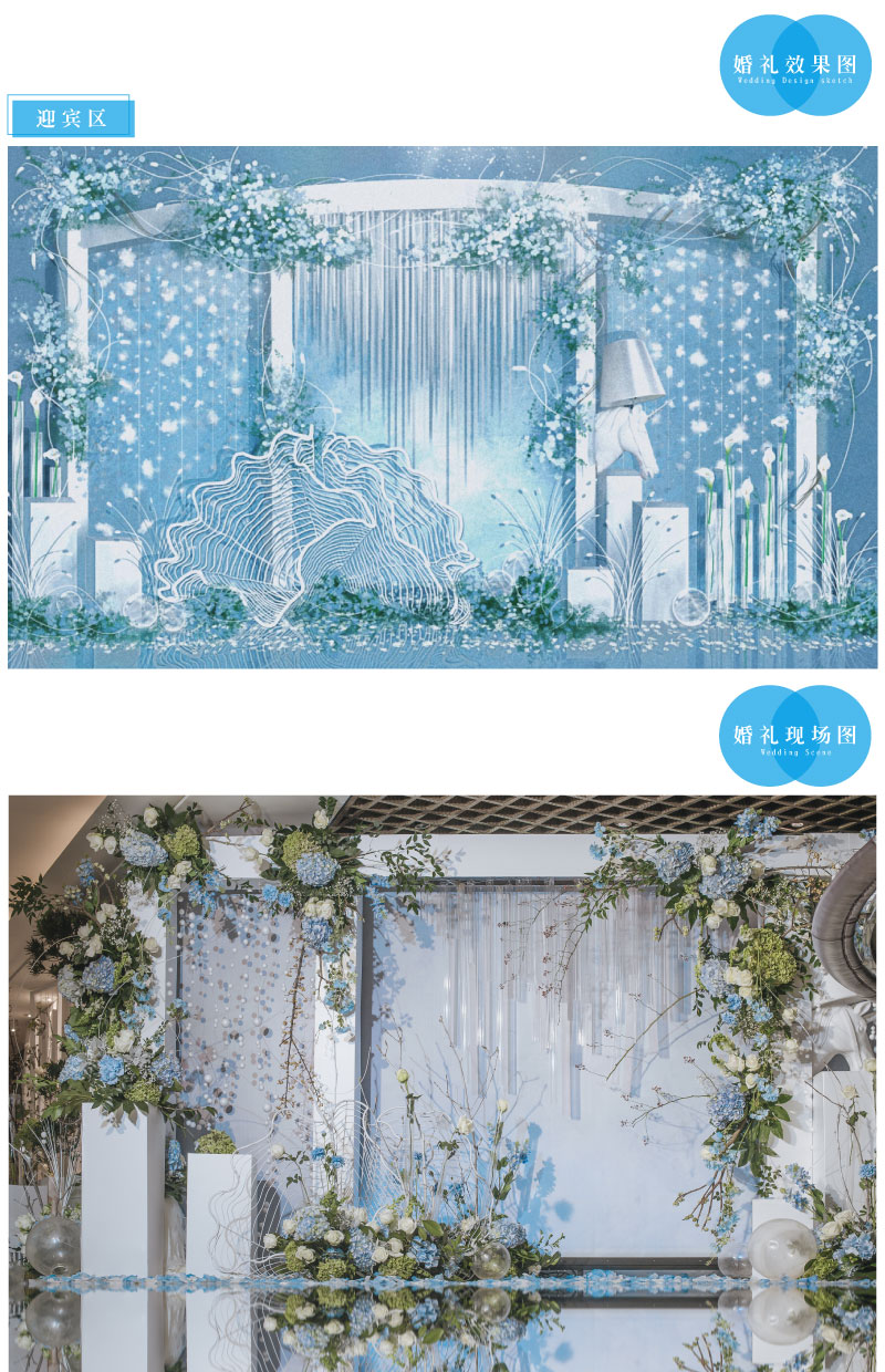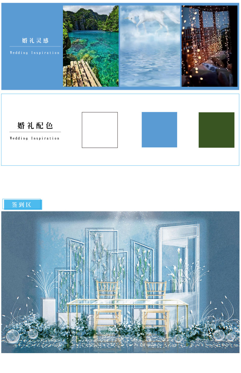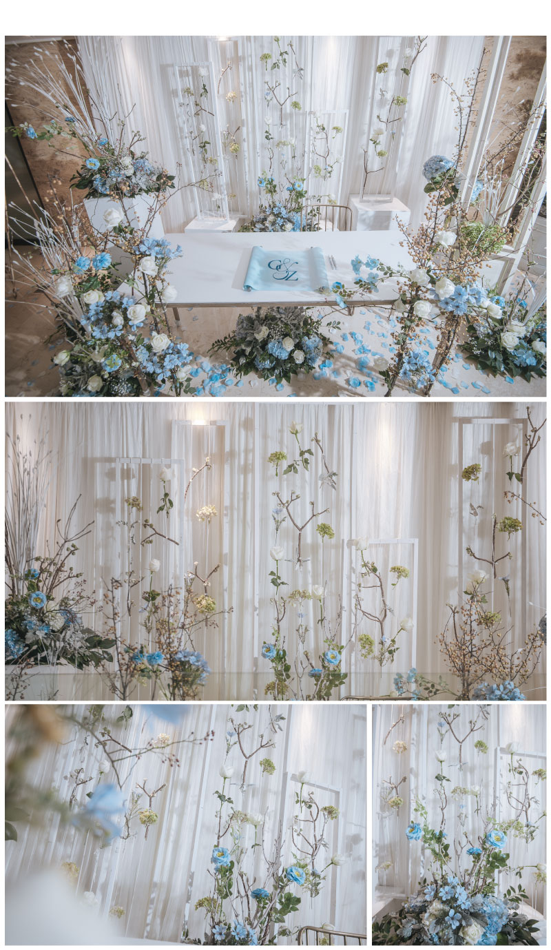 迎宾签到区:定制风格摆设道具 套餐内的方案构思、场地布置、喜好要求、报价明细等婚礼细节,我们都将为您专属定制,会根据每一对客人的喜好要求结合场地情况和预算做整体方案及报价。