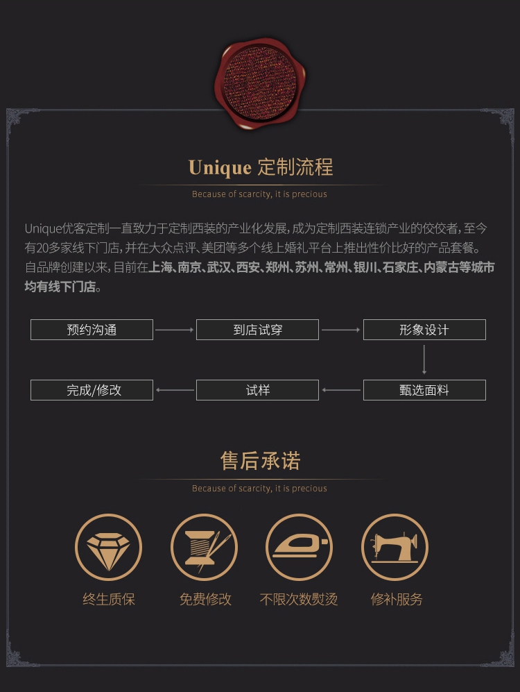 款式面料以店内实物为准 西装衬衣扣掉落可免费更换 提供免费绣字 享受终身免费修改,保养、熨烫 自行至店试装、挑选面料、量体 量体需0.5小时左右,10天后可试衣 试衣需0.5小时左右,试衣10天后可取