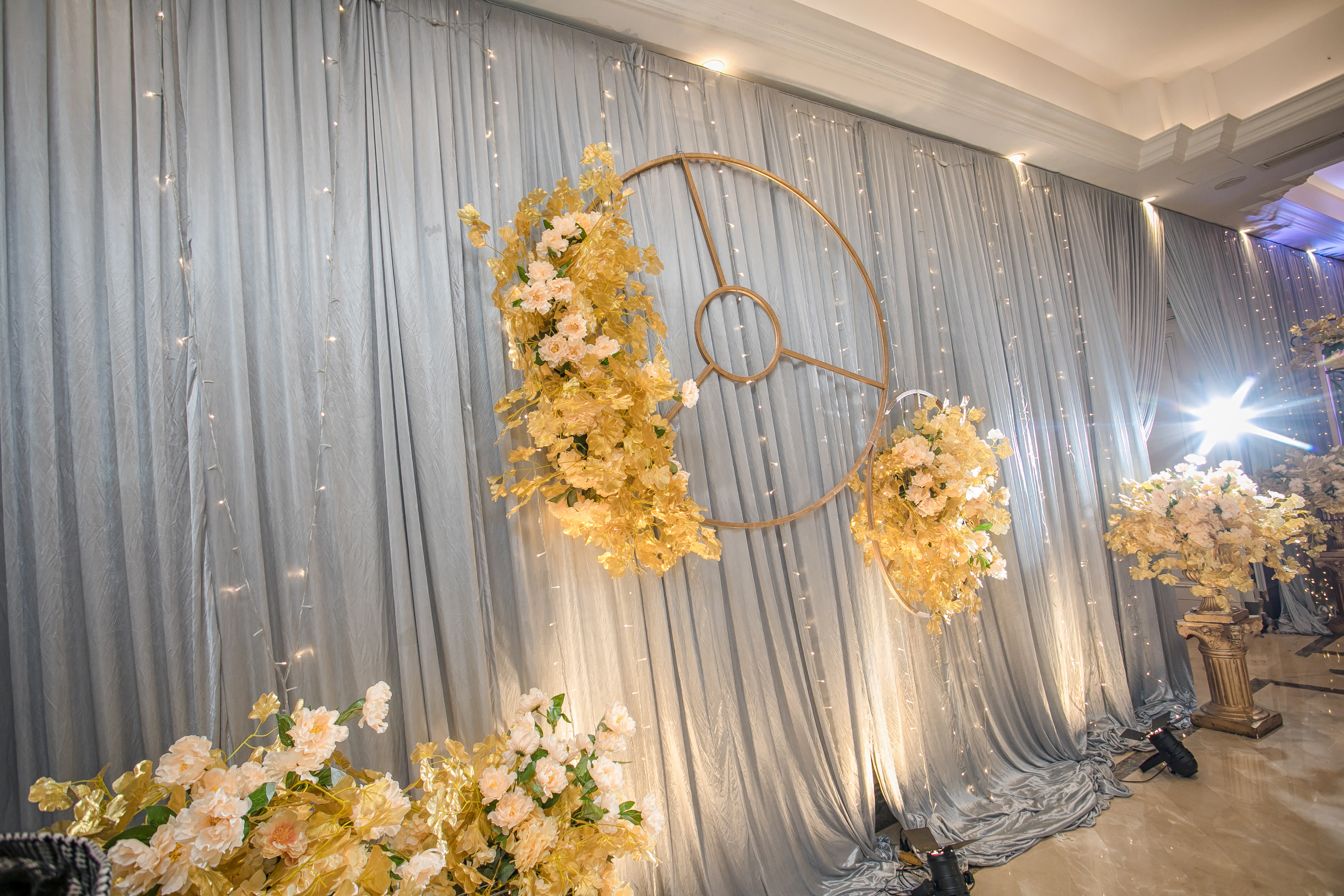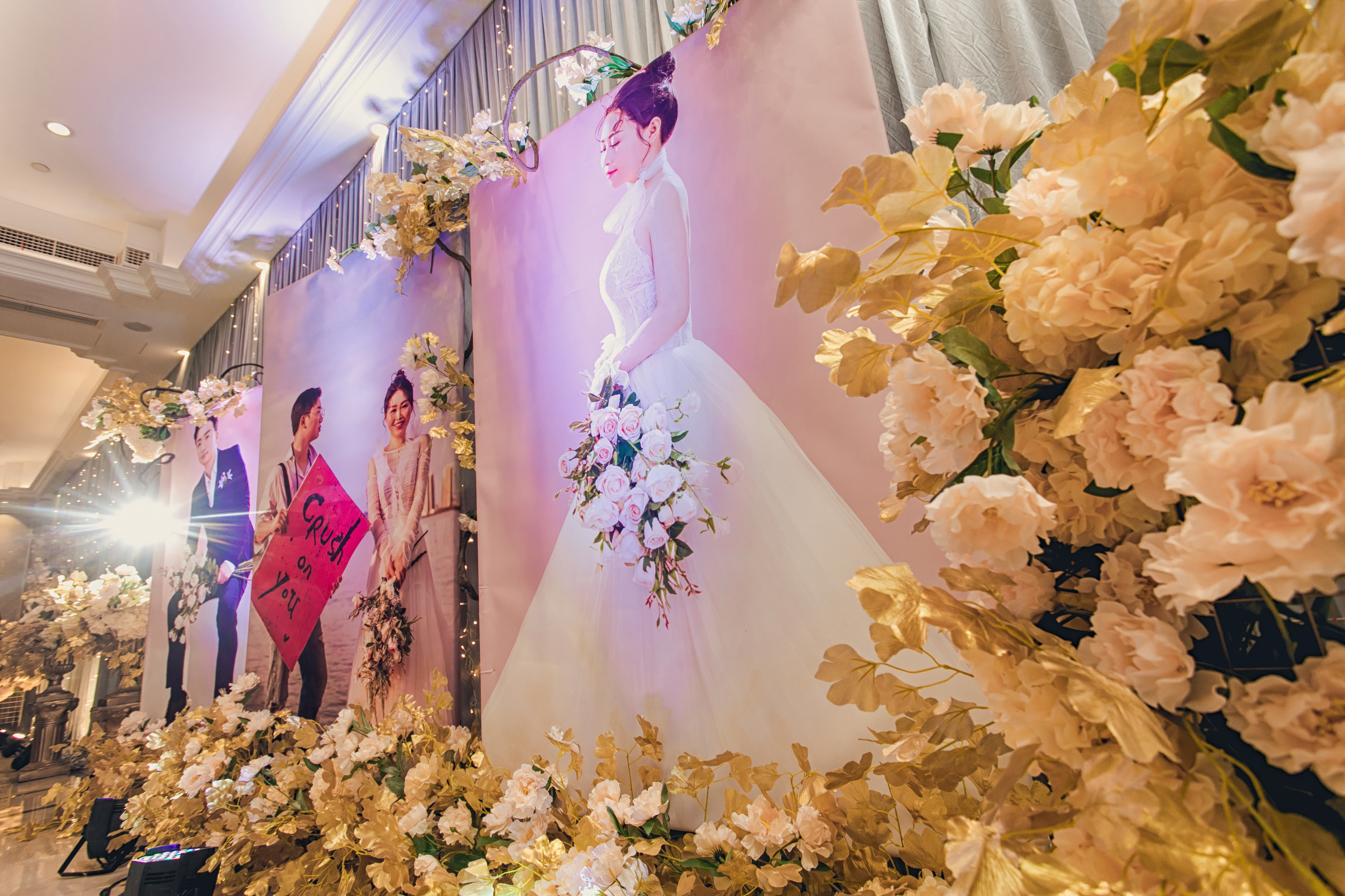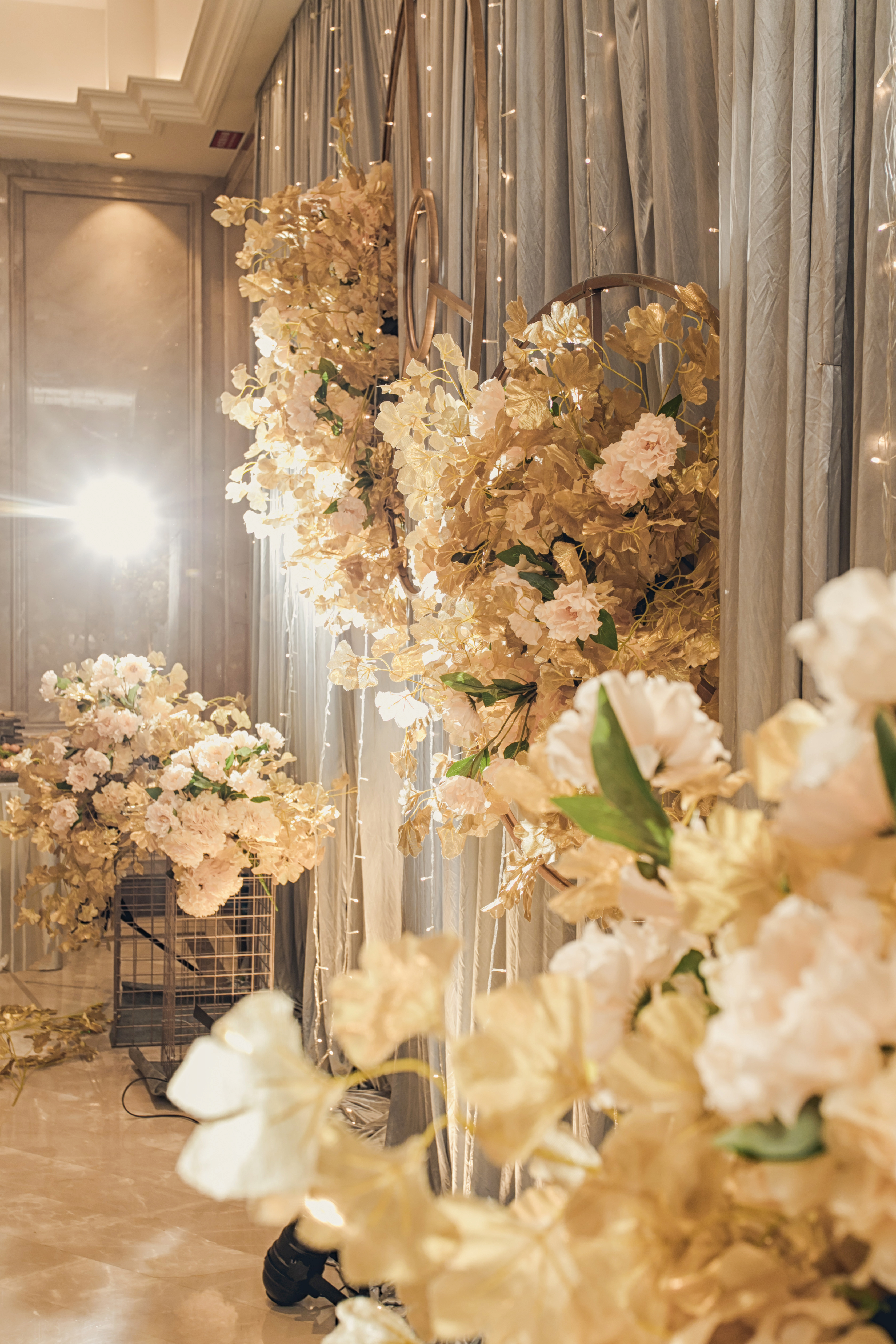 迎宾区一边由三张150x270厘米的油画布照片组成,用花艺点缀。 另一边由金色圆形铁艺和网格铁艺加花艺点缀组成