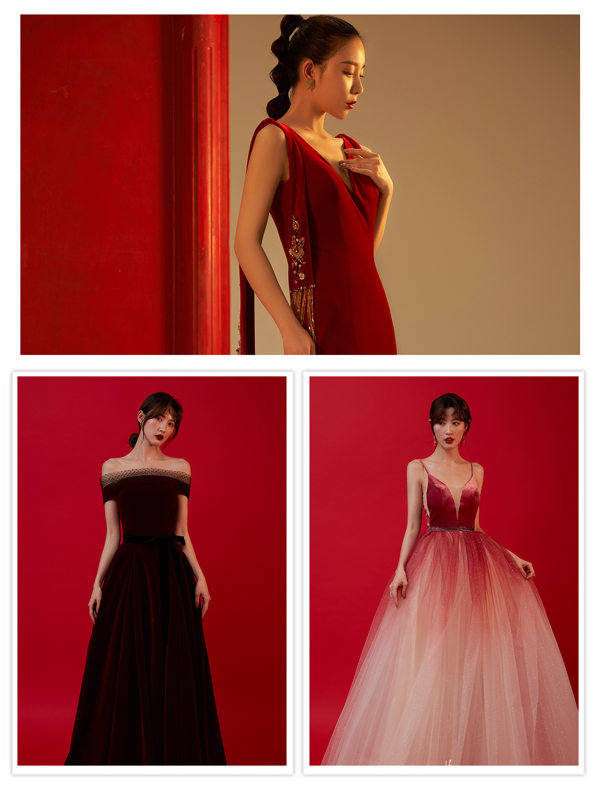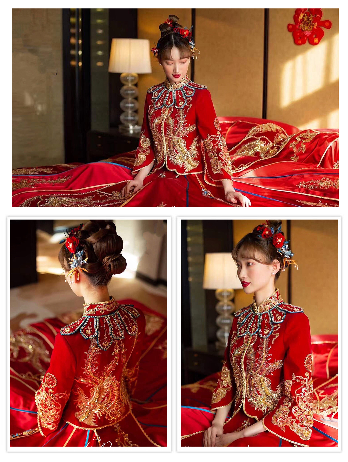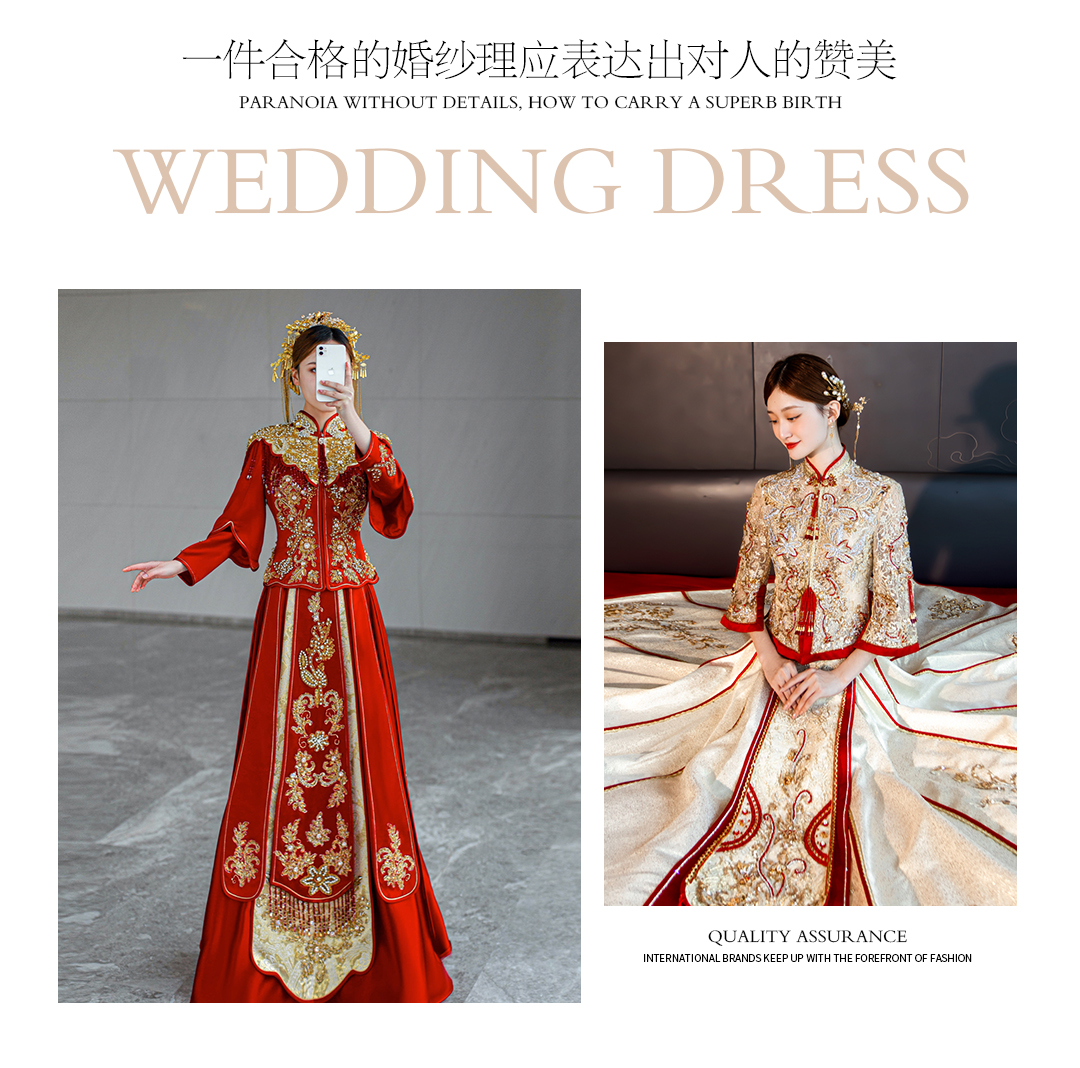 主婚纱:经典A款齐地婚纱 出门纱:中式秀禾/出门纱 敬酒服:高档红色敬酒服