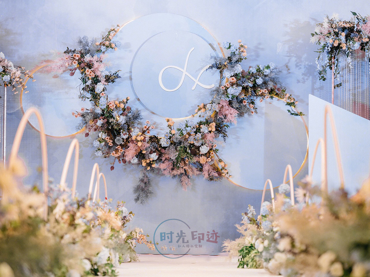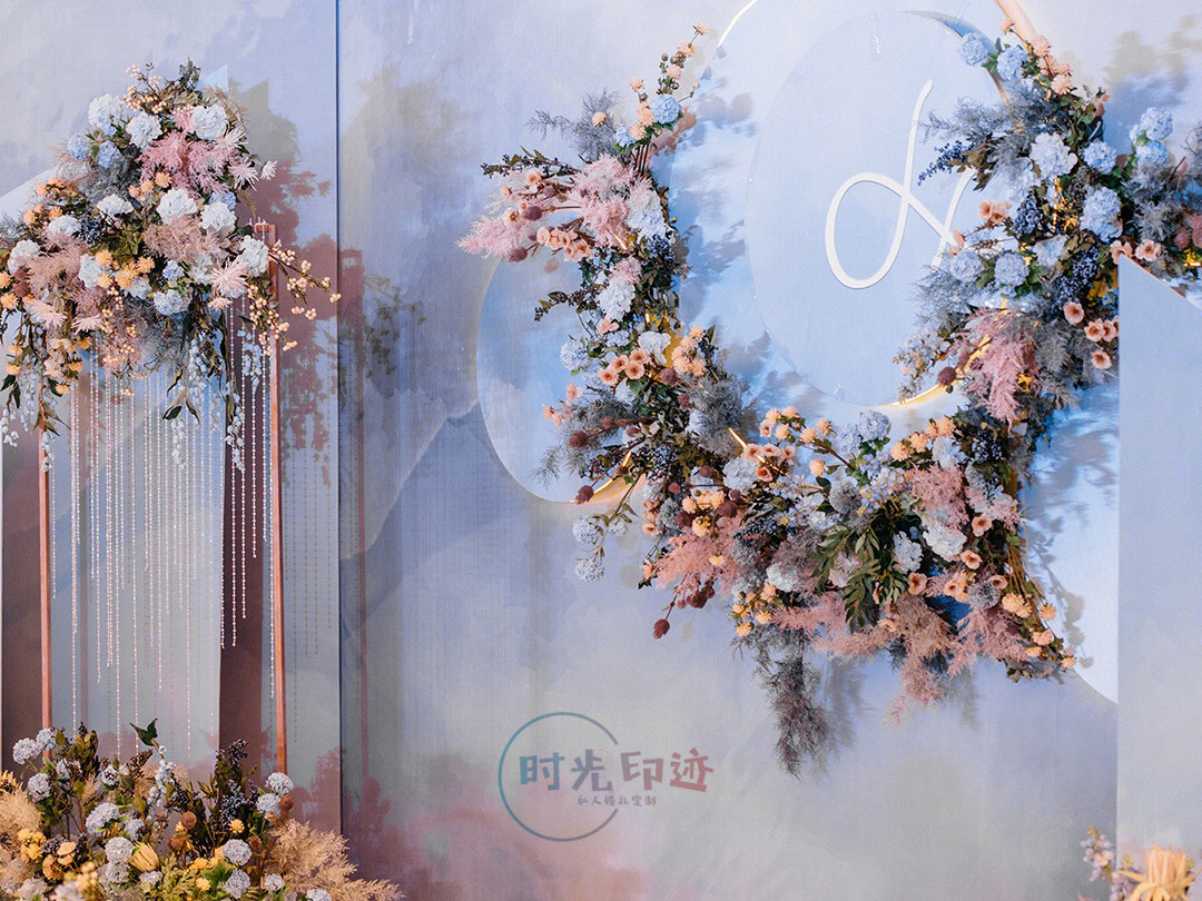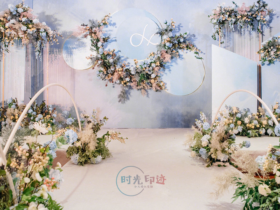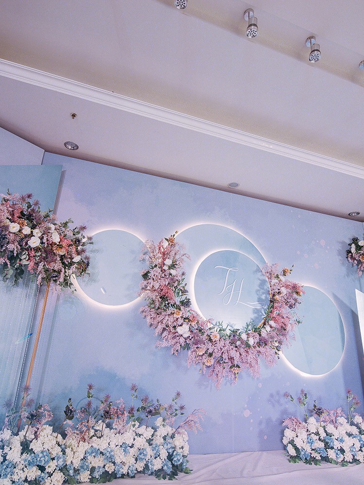 主舞台打底造型为喷绘造型,中心加圆形kt造型,舞台两侧为异形kt造型加花艺,整个舞台层次感非常好