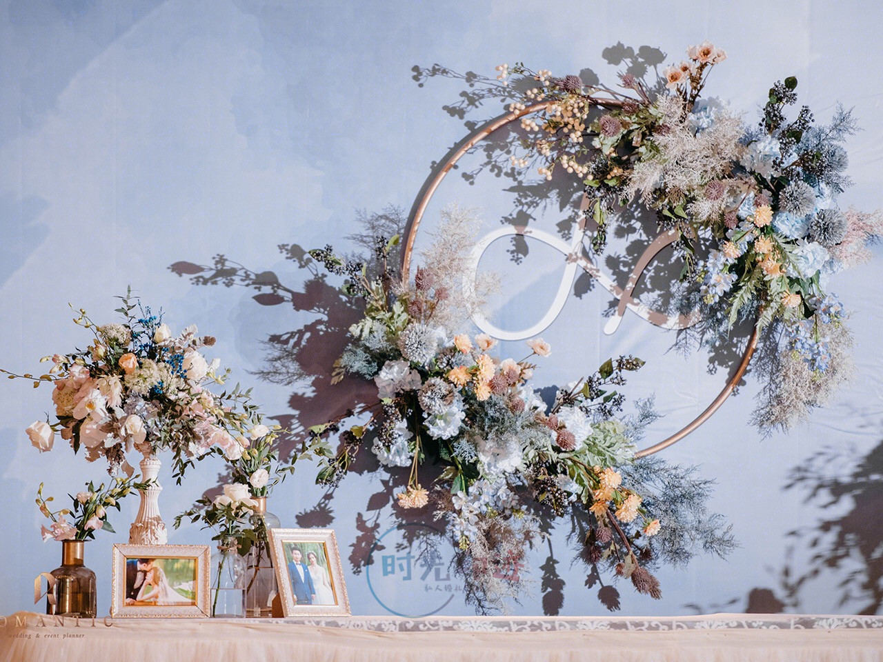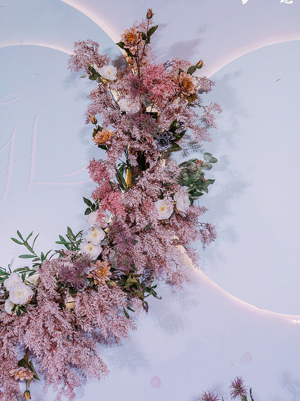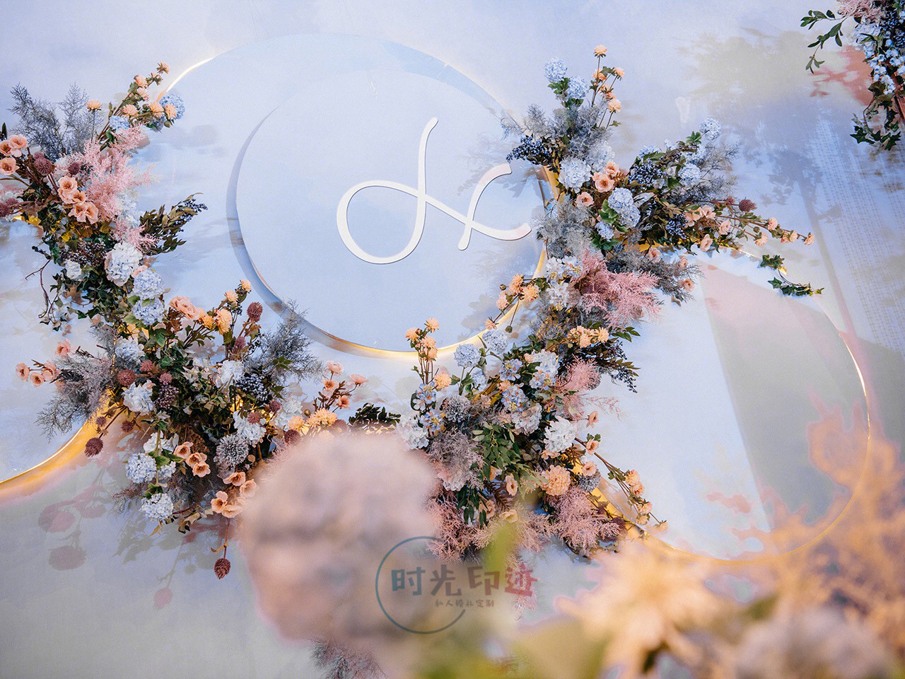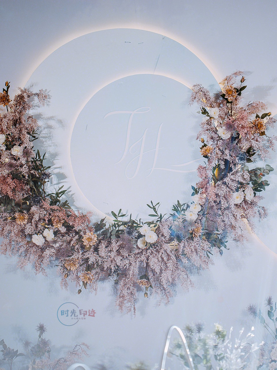 主舞台打底造型为喷绘造型,中心加圆形kt造型,舞台两侧为异形kt造型加花艺,整个舞台层次感非常好