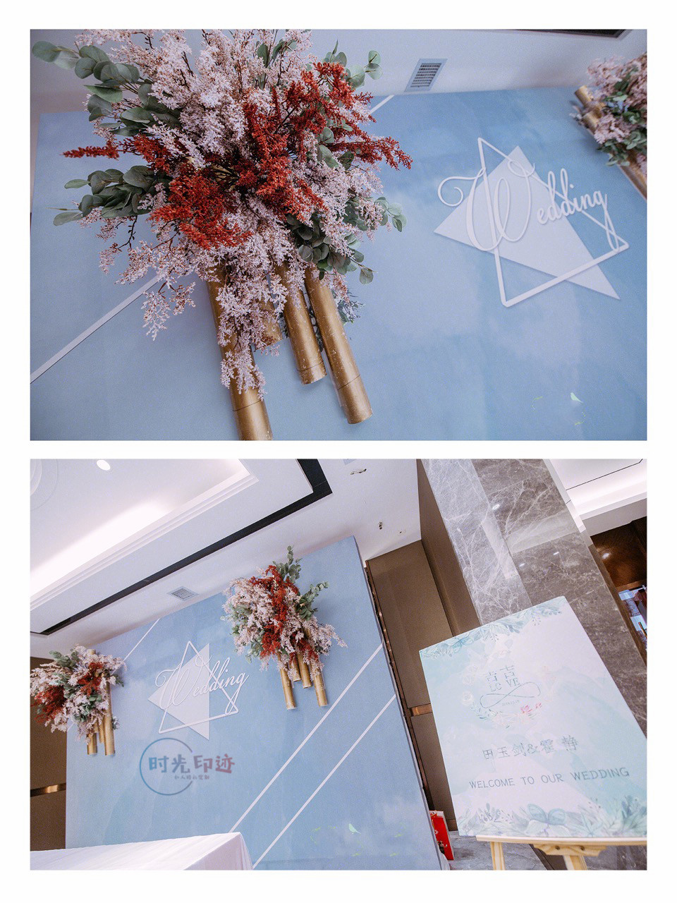 迎宾区为设计感喷绘造型,pvc金色和花艺造型