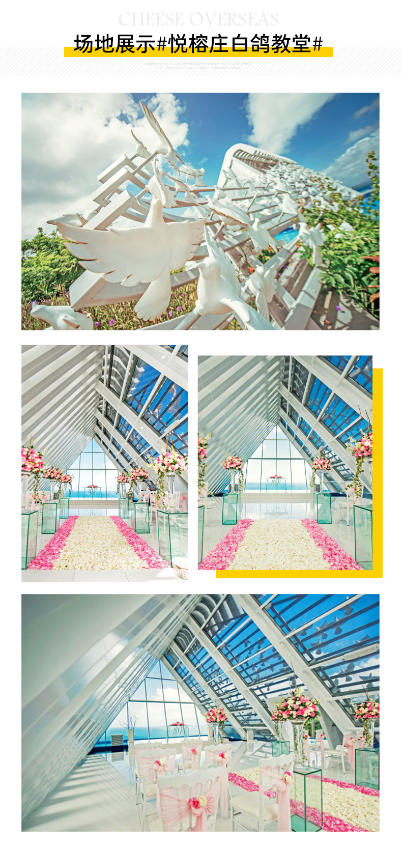 悦榕庄教堂于2014年5月底建成,教堂外观的一侧墙面上整齐的雕刻着一片翱翔于天空的白鸽,代表着爱情飞扬于天空之中,自由与平静的爱之含义。希望传达给新人,尊重彼此的自由,爱情归于平静,家庭为之港湾的人生意义。悦榕庄酒店坐落于巴厘岛南端的半岛悬崖之上,您可以在这里可以欣赏印度洋的全景和大自然的神秘魅力。。