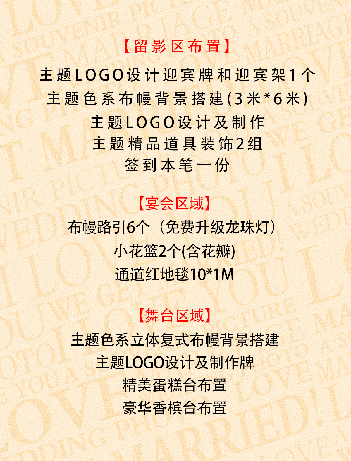 1.婚礼照片全天拍摄400张以上 精修照片30张 2.婚礼视频全天拍摄剪辑后60分钟(根据婚礼情况而定) MV短片3分钟 3.婚礼化妆全天跟妆 早妆/新娘妆 晚妆可提前试妆 4.婚礼主持人提前和新人沟通 确定婚礼当天事宜,婚礼开始前和新人沟通详情 5.即影即有无限张(加长版、包设计) 6.中西式婚礼布幔风格布置